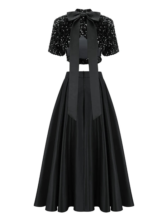 Two Piece Sets, Stand Collar Short Sleeve Spliced Sequins Tops High Waist Skirt Chic.