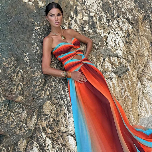 Blue-Orange Gradient Hollow One Piece Skirt Women.