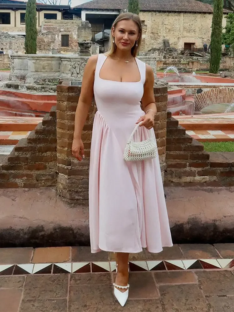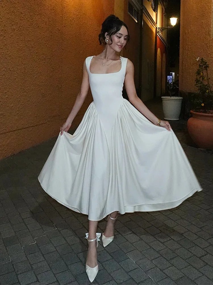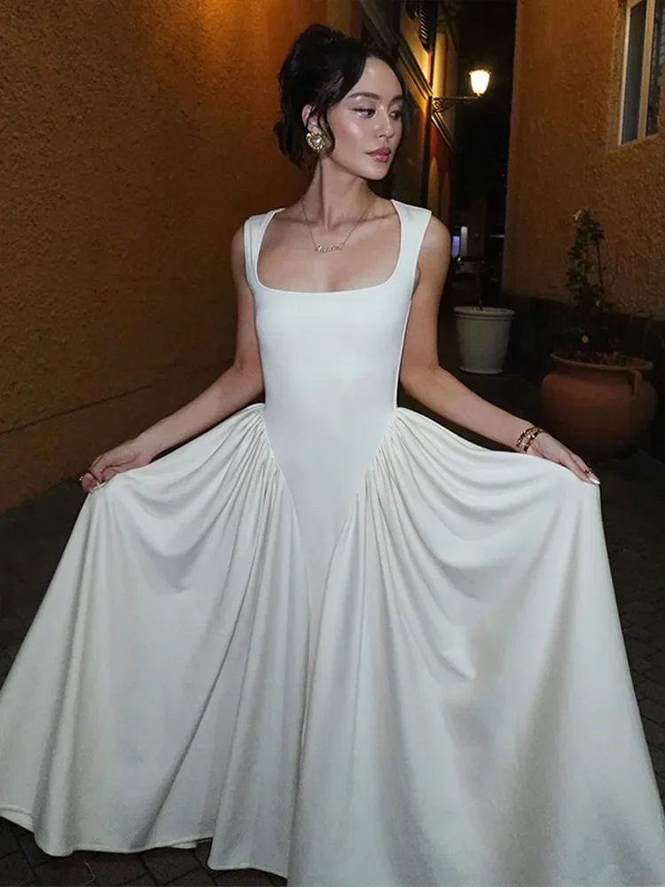 Square Collar Waist Cinched Slimming Pleated Fishbone Fluffy Long Dresses